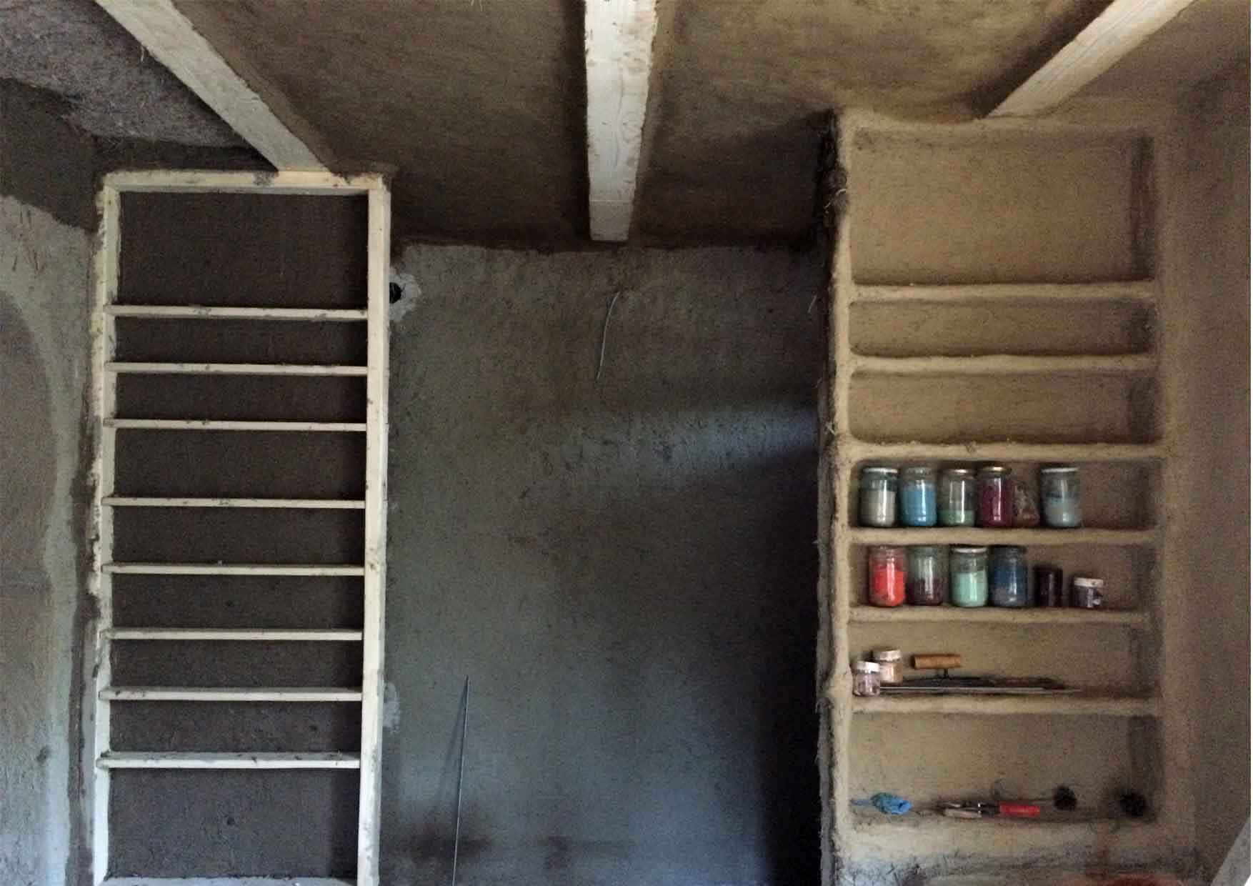Bojan olepljuje trsku na levoj polici, dok ja malterišem plafon.