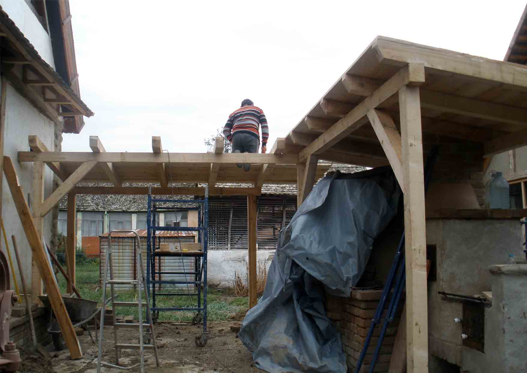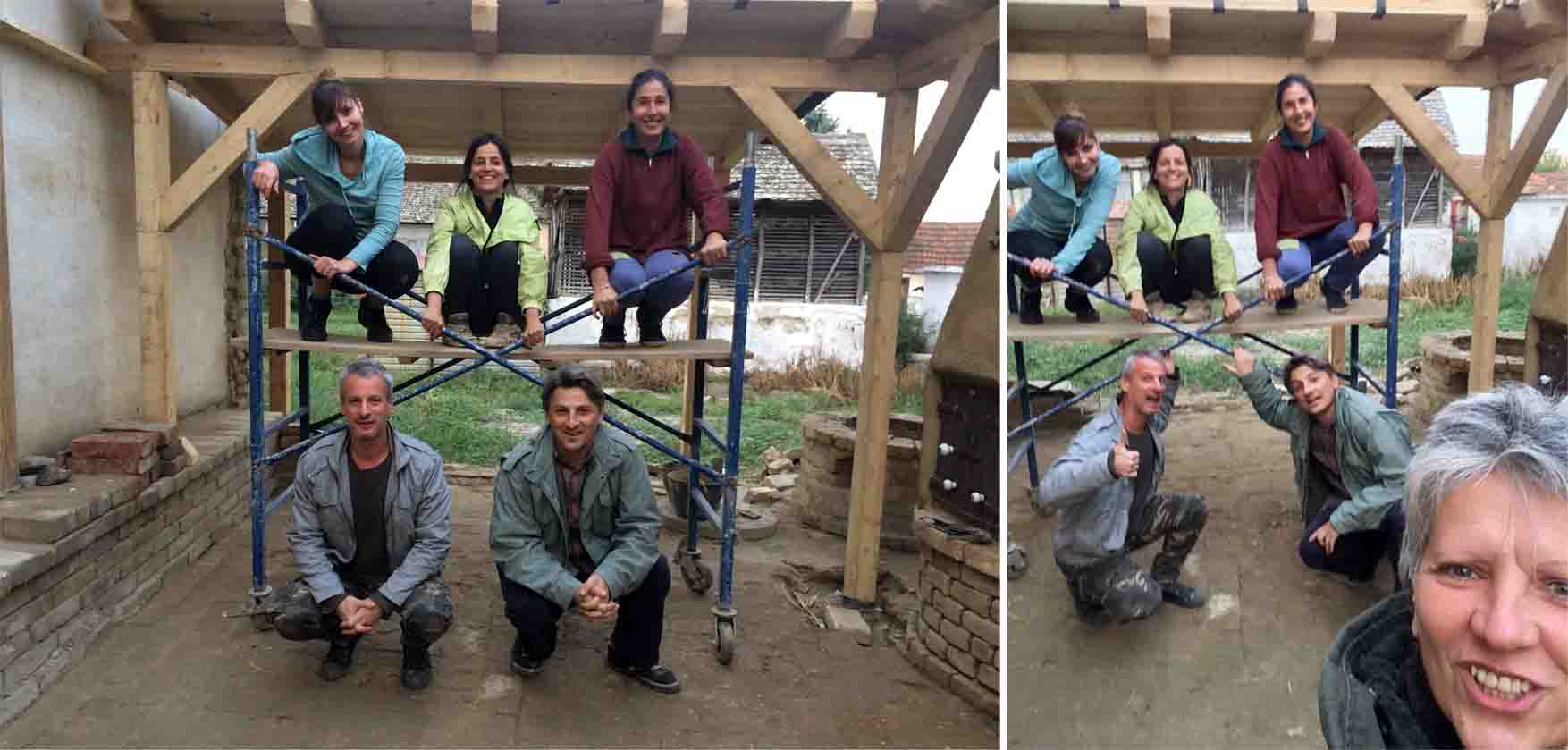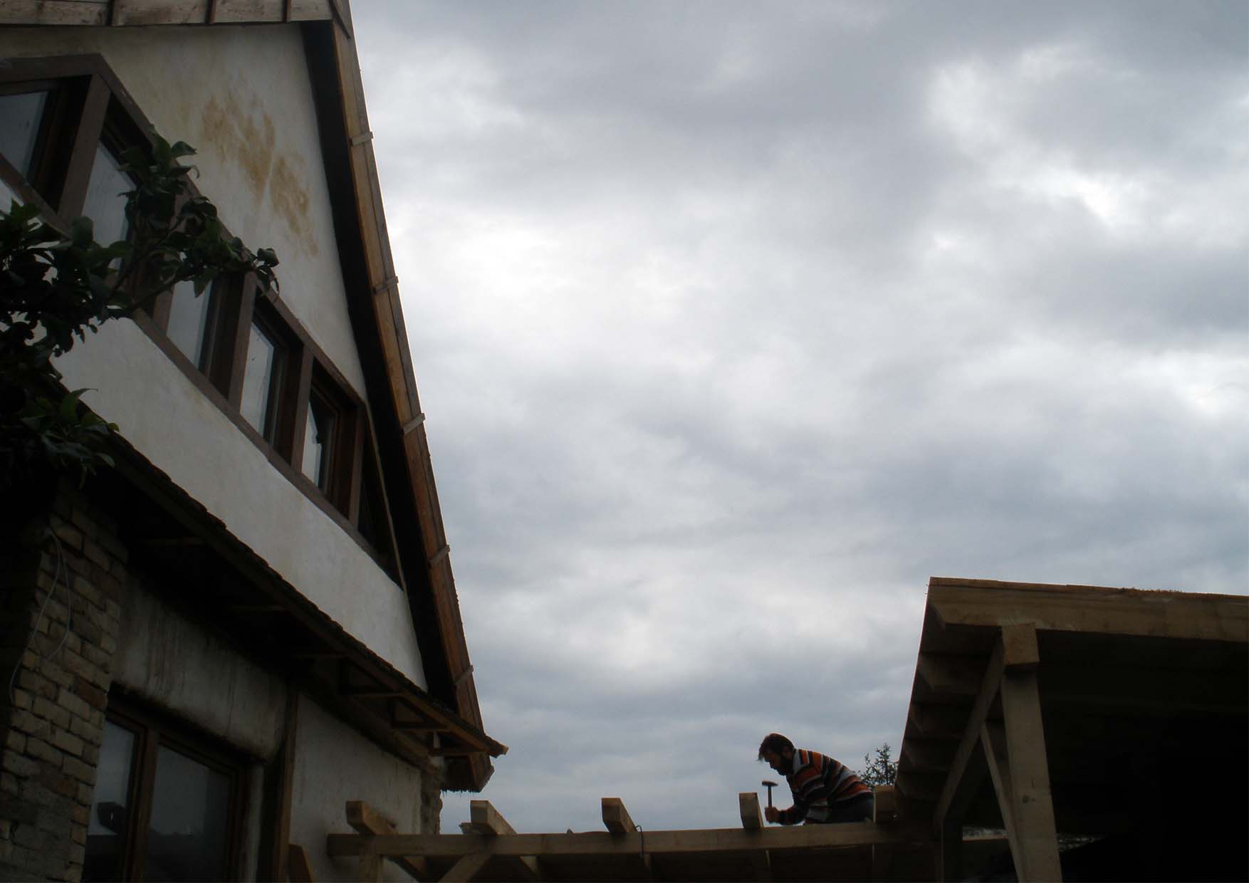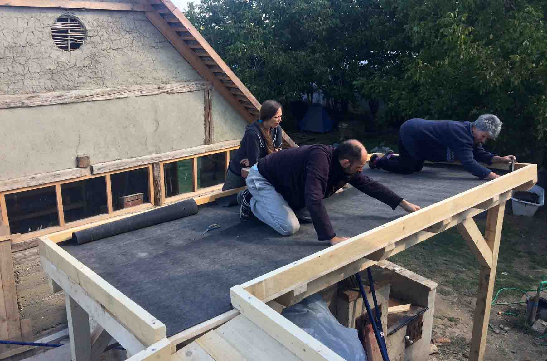 ujutru stiže RTS ekipa, a mi, sa Majom, Sašom, Anom i Jelicom radimo drugi deo nadstrešnice – ostaju zaštitne letvice, opšivka oko odžaka i kamenje koje planiramo postaviti pri obodu…