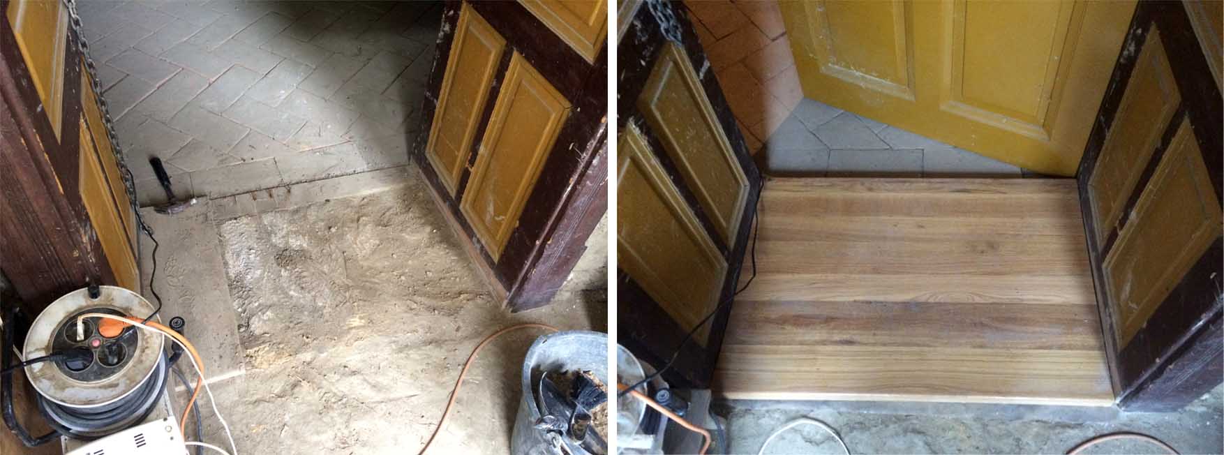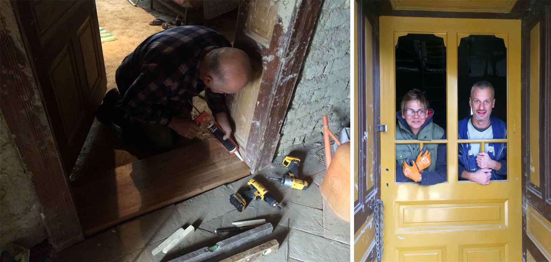 a vraćaju i restaurirana ulazna vrata na mesto :) merimo šank, klupu oko pećke i klupu od ćerpiča…