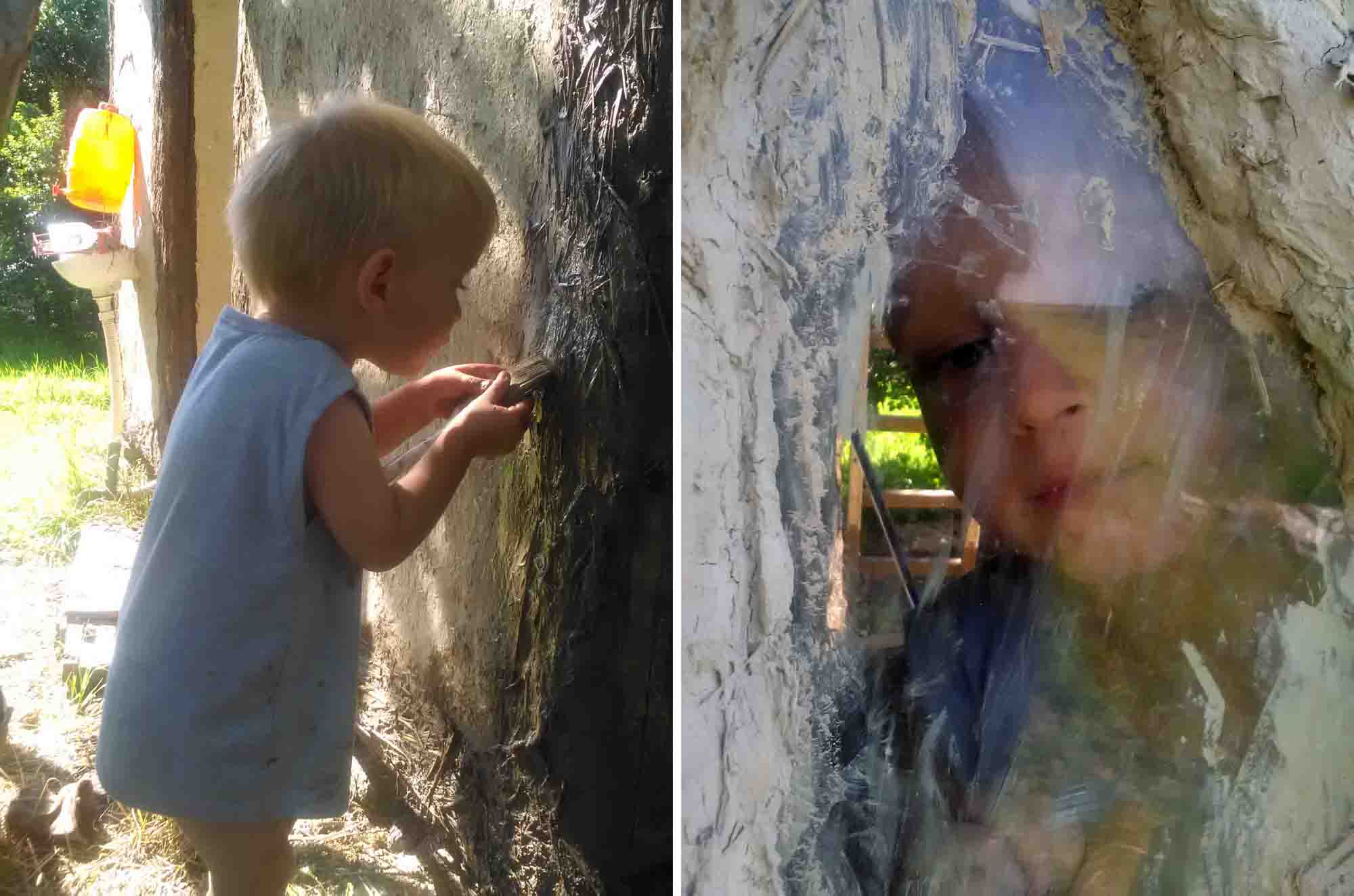 zatvaraju se trouglovi ispod krova :) recikliramo drvene komade,učvršujemo samo zemlja-slamom i oblikujemo :) sve drvene elemente spolja i iznutra prekrivamo istom smesom.