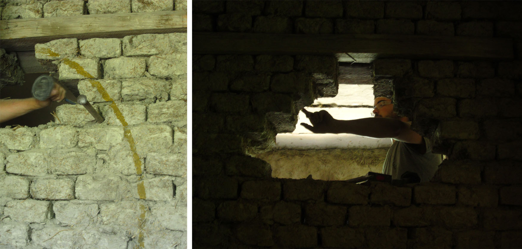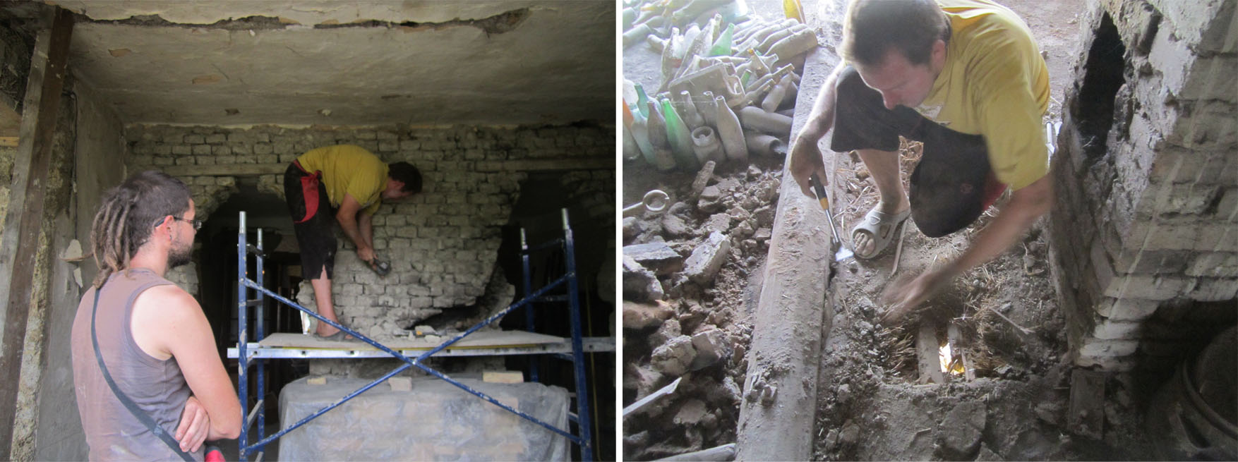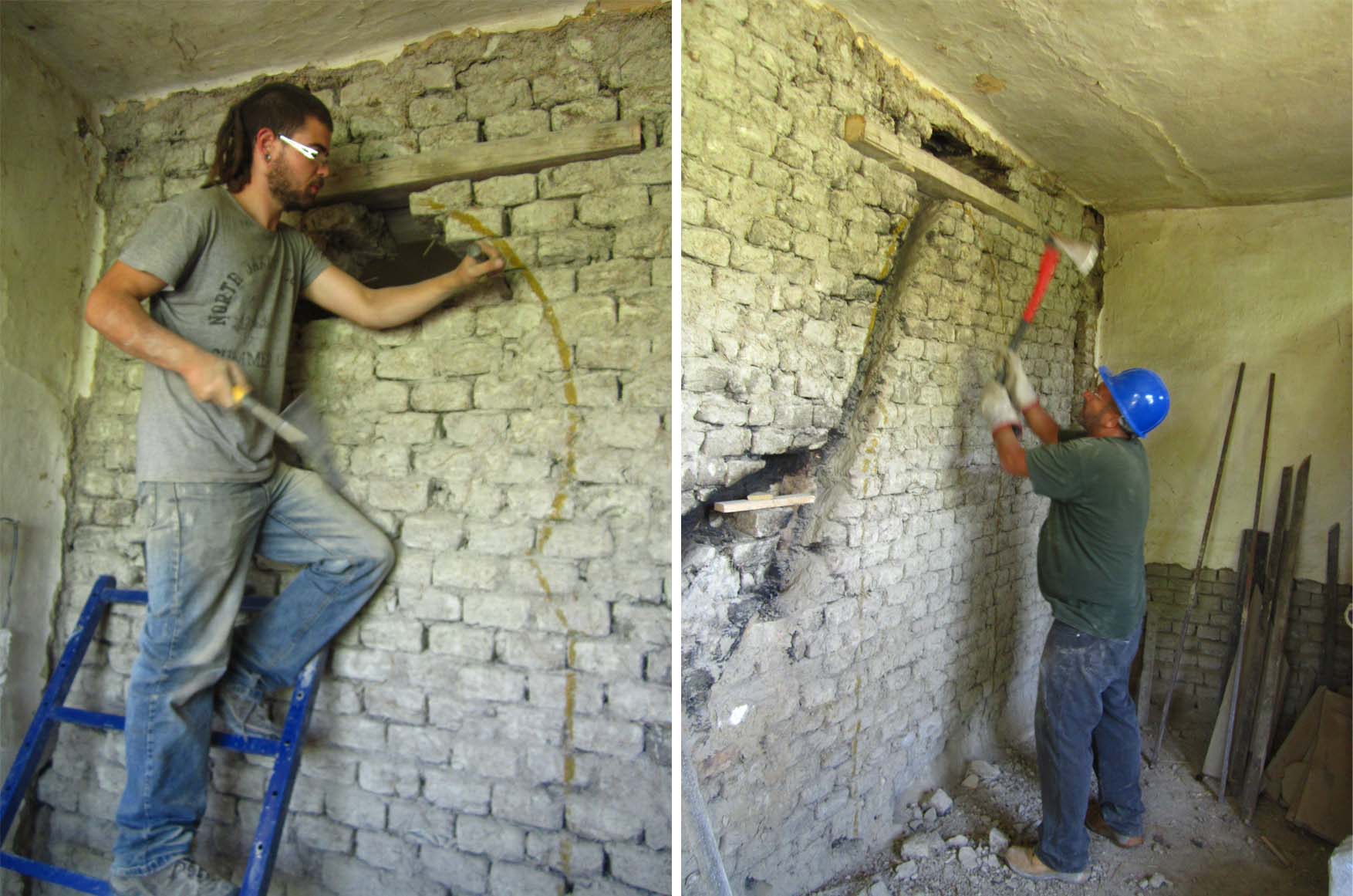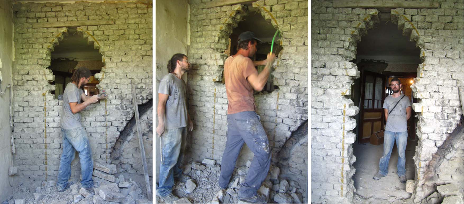 ali, pre zidanja šporeta, bilo je potrebno da se (konačno) iseku naši potkovičasti lukovi, što je bio izazov u svakom pogledu! kako zid nije izgledao u najsjajnijem stanju (a pogotovo što se iznad jednog otvora nalazi dimnjak), odlučili smo da iznad otvora postavimo drvene nadvratne grede – što nije bio nimalo lak zadatak, jer je malter bio toliko loš da su nam ćerpiči iznad otpadali… Vinkić i Julian najzaslužniji su što je taj deo brzo i efikasno obavljen, uz pomoć Bojana i Zvonka!45 secenje zida Mosorin jun 2014nakon toga, počeli su sa sečenjem samih otvora, što je bilo jednako uzbudljivo kao i prethodno. 46 secenje zida Mosorin jun 2014trudili su se da iseku i sačuvaju što veći broj ćerpiča…47 secenje zida Mosorin jun 2014i konačno – naši mavarski lukovi su ugledali svetlost dana, kao što je i kuća dobila mnogo više svetlosti ovom intervencijom :) naravno, potrebno ih je još lepo doterati i isekati, što je Vinkić pokušao i testerom, ali biće vremena i za te detalje…48 secenje zida Mosorin jun 2014e, kad su oni sve to tako lepo pripremili, lako je bilo majstoru da započne zidanje šporeta… 53 zidanje sporeta Mosorin jun 2014zidanje prvih redova…54 zidanje sporeta Mosorin jun 2014 pa smo već odmakli…55 zidanje sporeta Mosorin jun 2014ako i nije od zemlje, bar radimo blatnim malterima :)56 zidanje sporeta Mosorin jun 2014 jedna rupa za ogrev, drugu smo ispunili!57 zidanje sporeta Mosorin jun 2014 da vidimo gde nam dođe šporet, a gde “lerna” :)59 zidanje sporeta Mosorin jun 2014e, sad kad smo došli skoro do kraja, ispalo je da će biti visoko za gospođu mene da kuvam, pa je suprug još jednom intervenisao :) iako meni ništa nije smetalo i sve je bilo dobro, garant ću mu biti zahvalna jednog dana…61 zidanje sporeta Mosorin jun 2014taman kad sam mislila da sve ide kao po loju, pokrenuta je nova diskusija – cev spolja ili zasecanje zida od ćerpiča i pravljenje odžaka… na Vladino i Bojanovo insistiranje, krenulo se sa usecanjem:62 zidanje sporeta Mosorin jun 2014 a potom je Palfi olepio odžak malterom i zatvorio biber crepom, kao što je to ranije bilo…63 zidanje sporeta Mosorin jun 2014“lerna” dođe levo, šporet desno, pa se prave kosine i ostavljaju otvori za cirkulaciju vazduha…65 zidanje sporeta Mosorin jun 2014 a naš šporet počinje da liči na to što treba…66 zidanje sporeta Mosorin jun 2014 samo još da kupimo tu famoznu metalnu ugradnu “lernu”, pa da je zatvore… inače, sve se ovo dešava 1.jula oko podne, kad ja već pakujem svoje prnje, ostavljam instrukcije Bojanu i Vinkiću i krećem put Rogljeva na radionicu… tako da ćemo nastavak videti i vi i ja u subotu 19.jula!67 zidanje sporeta Mosorin jun 2014a da ne bude da su samo majstori radili – i mi smo bili vredni! toalet je dobio svoj završni sloj, koga je samo još trebalo okrečiti. nažalost, kako nismo imali dovoljno vremena, plašim se da ga je kiša sprala i da ćemo morati da ponovimo… Bojan kaže da nikad neće biti gotov, a ja se setim onog japanskog hrama koga su rušili da bi ga ponovo sagradili i mislim da je to u redu…50 malteri Mosorin jun 2014i ne samo to – imamo još jednu lepu malu novinu:51 malteri Mosorin jun 2014prozore na toaletu, šta kažete :) ?! još par malih intervencija i biće to simpatični toaletić!52 konacno prozori Mosorin jun 2014a tek da znate kako se dobro jelo! najzaslužniji za to je naš dragi Vinko, bivši šegrt u zagrebačkom restoranu i majstor u pripremi sezonskih obroka!      69 klopa Mosorin jun 2014naravno, ni Francuzi nisu ostali dužni i začinili su (skoro svaki) obrok kamion-made sirom i “poule au pot” (ako se dobro sećam) ručkom:70 klopa Mosorin jun 2014jedan dan imali smo sjajni veggie i ne-veggie pasulj pripremljen od strane Vlade od Ruskog Krstura; kao i Vinkićevu sjajnu baranjsku buraniju tj.BAraniju ;)71 klopa Mosorin jun 2014iako nije bilo lako naterati nas sve u isto vreme na pauzu, bilo je zadovoljstvo provesti ove trenutke užitka zajedno! inače, veliku zahvalnost mesojedi iz ekipe duguju komšijama Olji i Vladi, koji su ih snabdeli piletinom:80 ruuuucak Mosorin jun 2014a ja bih, od 6 do 8 svako jutro, u tišini i miru, provodila vreme u mojoj bašti… do poslednjeg dana uspela sam sve da iskrčim i oplevim i moja bašta konačno je ličila na baštu (nažalost, nemam sliku; a do sad se, verovatno, vratila u prvobitno stanje!), a našla sam i neke neočekivane biljke – poput korijandera mog omiljenog, mirišljavog, divnog!72 korijander Mosorin jun 2014i prvih malina, ponosna ja :)))73 prve maline Mosorin jun 2014e, da ne bude da se samo radi, u subotu popodne smo krenuli i u ekipnu šetnju selom, u obilazak vile, crkve na bregu:81obilazak Mosorin jun 2014Bojan ih na bregu navodi na ludorije…83 Bojanove zeze Mosorin jun 2014usput naiđosmo i na kuću bliznakinju ovoj našoj, s tim da su ovde zadržali drvene stubove u tremu, što Bojan želi vratiti i kod nas…93 kuca kao nasa Mosorin jun 2014a i na jednu zanimljivost – komšija je od biber crepa napravio šare na sokli! možda nije u našem fazonu, ali je, svakako, zanimljivo i vredno pomena :)90 komsijski dizajn Mosorin jun 2014u nedelju smo išli u posetu jednom komšiji-inovatoru, 99 komsijska pec Mosorin jun 2014koji je povezao kaljevu peć i centralno grejanje97 komsijska pec Mosorin jun 2014i greje se na sojinu slamu! svaka čast :) 98 komsijska pec Mosorin jun 2014a potom smo se odvezli do Tise, jedni motorom, drugi biciklima, treći trčeći (Sajko): 95 motor bicikl Mosorin jun 2014a potom smo uživali na suncu i popodnevnom nedeljnom miru:96 Tisa Mosorin jun 2014jedan od najlepših i najpametnijihi pasa kojeg sam u životu videla – prosto da poželiš da ostane zauvek kod nas :)74 Francuzi i Sajko Mosorin jun 2014e, možda to nije realno, ali ovo svakako jeste – maca koja je uskočila kroz prozor (sa dve druge), a koju sam dva puta izbacila (jer su nervirale majstore) i koja se j