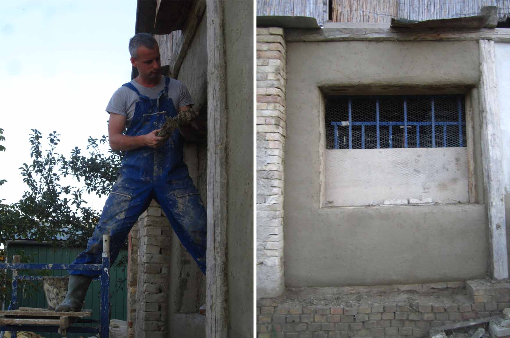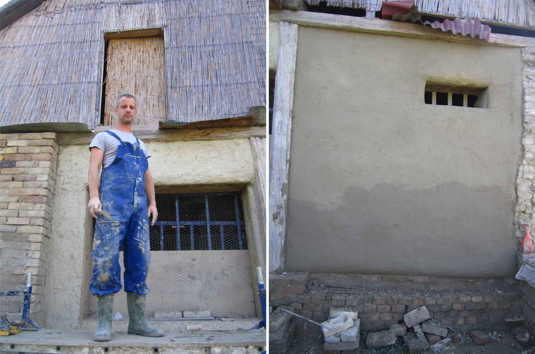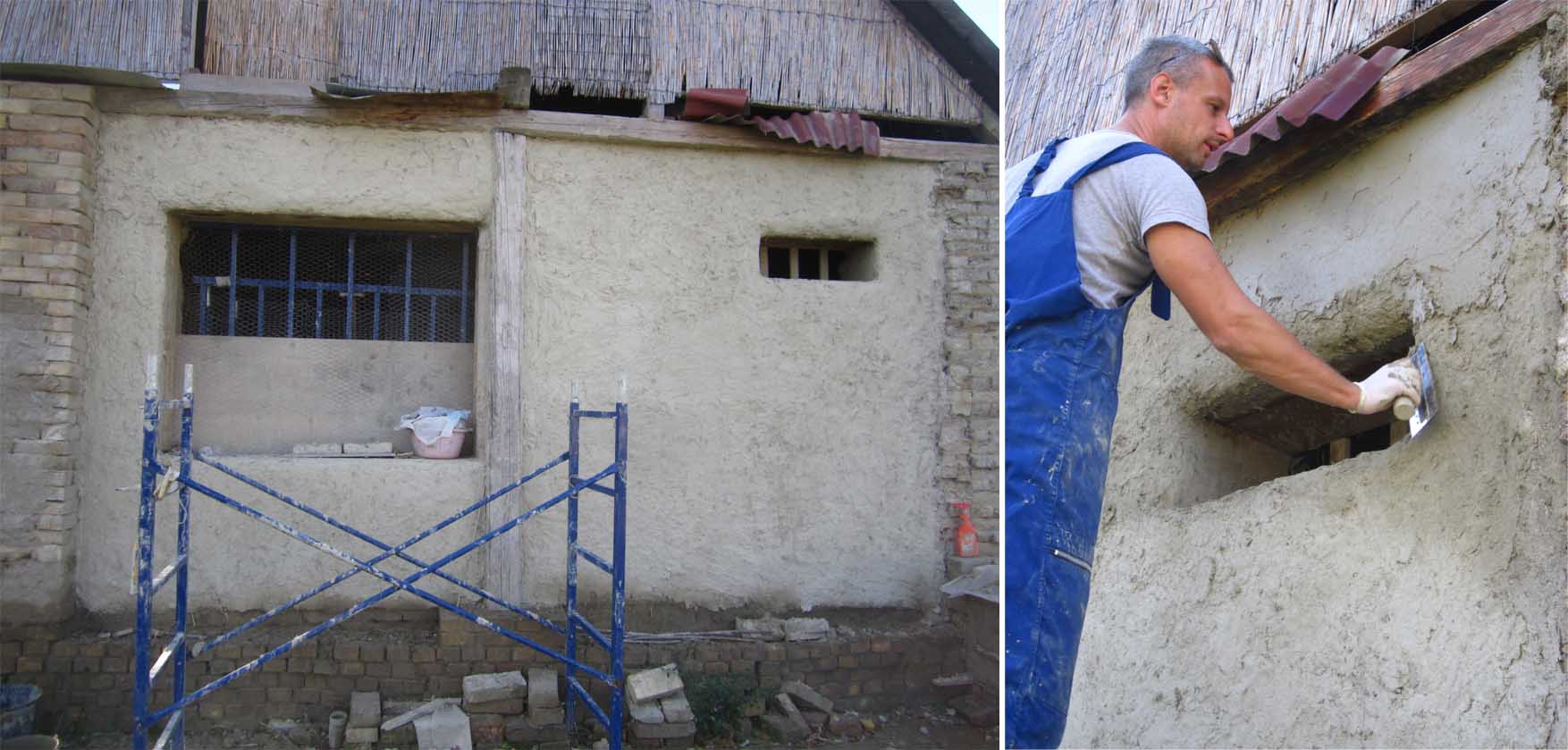 a moj malterisanje zapadnog zida prema komšijama… samo, pre malterisanja, trebalo je popuniti ove rupe(tine) – čini se da su ovaj zid radili iz delova i da su ovo bili spojevi… suviše uski da bi se ubacio ćerpič, ispunjavala sam ih mešavinom zemlja-slama, nabijala komadom armature (odnosno: letvicom), u zavisnosti od debljine. negde su bile duboke i do 40 cm…